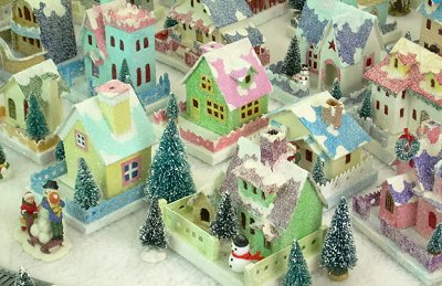 The tradition of setting up magical Christmas Villages on tabletops and mantels across America, began as a tradition of the Moravian Church, a Protestant denomination, and has continued to evolve over the last 130 years.Originally set under the Christmas tree, 'Putz' houses, as they were called, were typically made from cardboard and mostly manufactured in Japan and Germany. For a thorough history of Christmas Villages, visit Family Christmas Online and for instructions on how to build your own glittered 'Putz' house visit Cardboard Christmas.